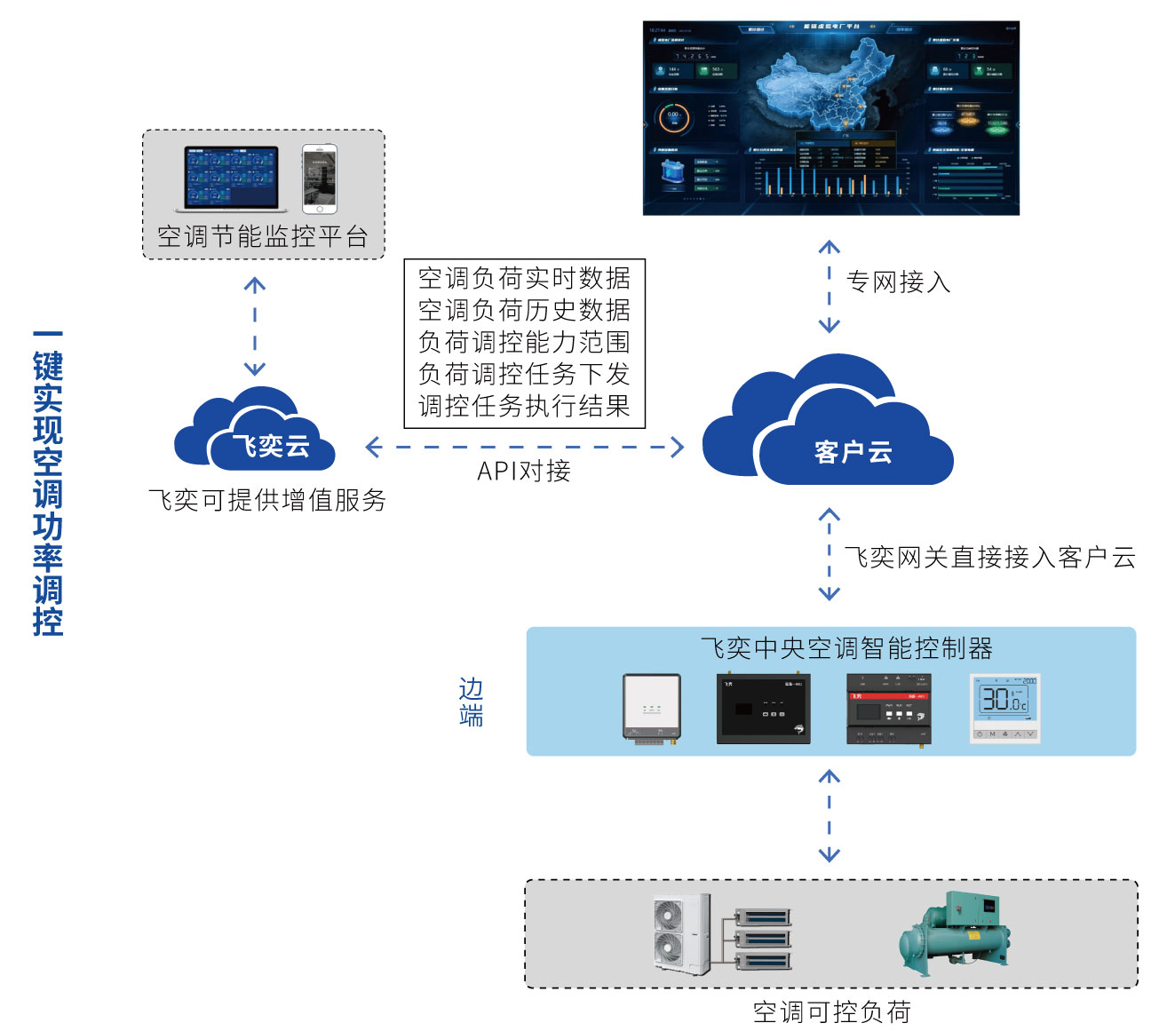 眾所周知,在虛擬電廠可控負荷中,中央空調一直作為能耗占比的大戶,也是負荷調控的重點,飛奕作為中央空調節能智控方面專家、虛擬電廠空調負荷調節一站式解決方案服務商,一直致力于為運營商伙伴提供專業的定制化產品及方案,助力其高效接入虛擬電廠響應體系,一鍵實現空調負荷調控。