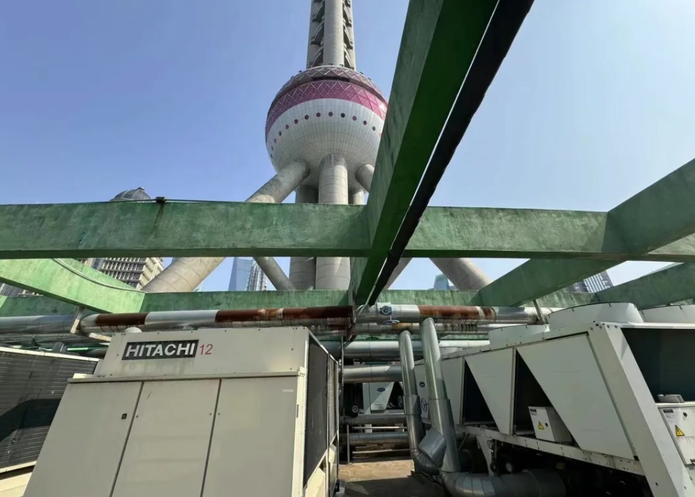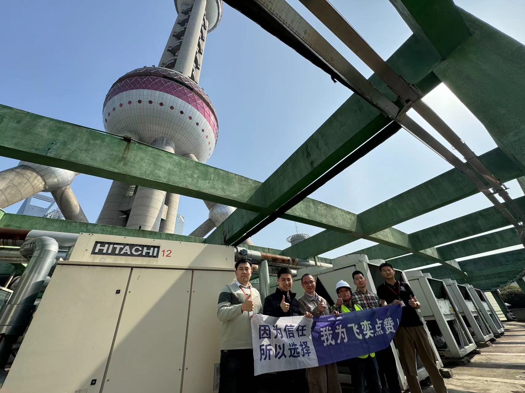 他們帶著產品登頂東方明珠塔,經過二十分鐘左右的操作,順利將日立和開利的風冷螺桿式冷水機組完成對接,并調試成功。
