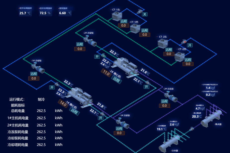 針對院方需求,飛奕科技憑借其在智慧樓宇領域的技術優勢,為醫院量身定制了解決方案。本次項目采用了飛奕科技的機房群控系統,成功對接并高效控制了院方現有的格力磁懸浮主機。該方案具有施工周期短、成本低的顯著優勢,不僅如此,該平臺系統可實時在線遠程巡檢,用戶登錄空調管理平臺,即可對冷機、水泵、冷卻塔等設備進行遠程監控、狀態監測、故障反饋與歷史數據統計,實現一站式高效運維管理。